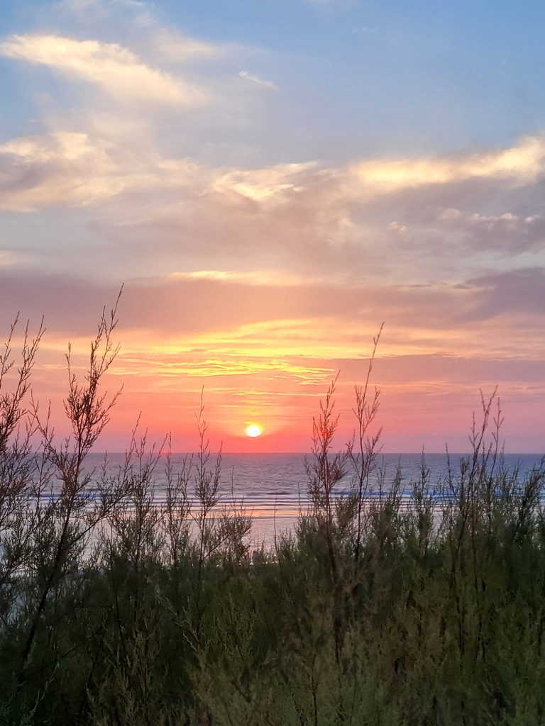 Mon clan me rejoint et nous allons nous éclabousser dans ces vagues si calmes en cette fin d’après-midi. L’océan semble triste lui aussi. On joue au ballon et nos rires viennent éclipser les autres vies de la grève. Le goût salé ne nous quittera pas. Un câlin de famille. Un silence vers le couchant. Comme ces vacances sont belles … une fois de plus.